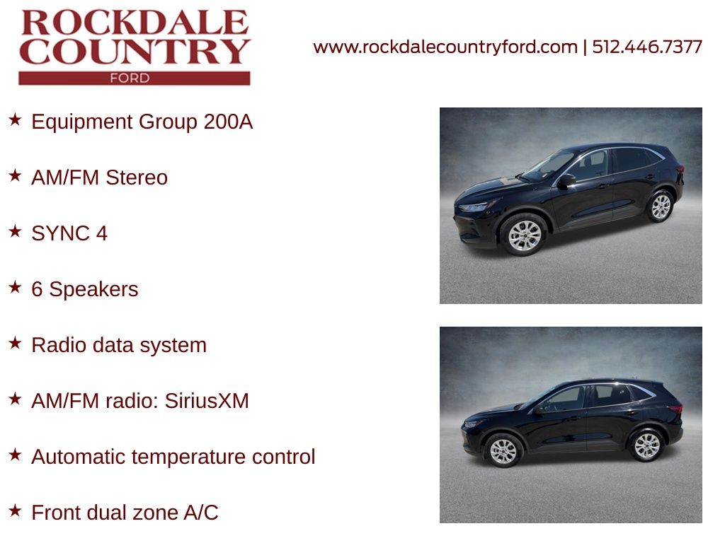 Escape Active, 4D Sport Utility, 1.5L EcoBoost, 8-Speed Automatic, FWD, Black Metallic, Ebony Cloth, 3.81 Axle Ratio, 6 Speakers, Alloy wheels, AM/FM radio: SiriusXM, AM/FM Stereo, Auto High-beam Headlights, Automatic temperature control, Brake assist, Bumpers: body-color, Compass, Delay-off headlights, Driver door bin, Driver vanity mirror, Dual front impact airbags, Dual front side impact airbags, Electronic Stability Control, Emergency communication system: SYNC 4 911 Assist, Equipment Group 200A, Exterior Parking Camera Rear, FordPass Connect, Front Bucket Seats, Front Center Armrest, Front dual zone A/C, Front License Plate Bracket, Front reading lights, Fully automatic headlights, Illuminated entry, Knee airbag, Outside temperature display, Overhead console, Panic alarm, Passenger door bin, Passenger vanity mirror, Power door mirrors, Power driver seat, Power Liftgate, Radio data system, Rear reading lights, Rear seat center armrest, Rear window wiper, Speed control, Speed-Sensitive Wipers, Split folding rear seat, Spoiler, Steering wheel mounted audio controls, SYNC 4, Tachometer, Telescoping steering wheel, Tilt steering wheel, Trip computer, Unique Cloth Front Bucket Seats, Variably intermittent wipers, Wheels: 17" Shadow Silver-Painted Aluminum.